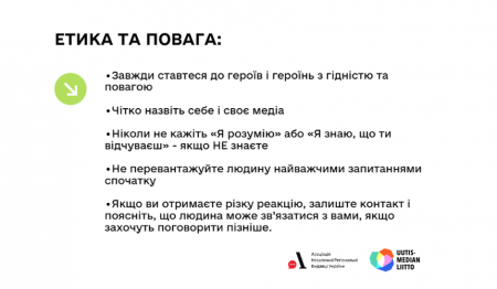 Травма-інформований підхід допомагає працювати з такими історіями уважно й відповідально. Він вимагає від журналіста розуміння процесів горювання, знання базових реакцій на травму та усвідомлення власних меж. Як сказала медійниця і тренерка Тетяна Трощинська під час вебінару з травма-інформованої журналістики (організованого в рамках проєкту «Медіамости: Фінляндія — Україна»), журналісти не є психологами і не можуть виконувати їхню роботу. Але саме тому важливо пам’ятати про обмеження: наше завдання — зібрати інформацію й розповісти історію так, щоб не нашкодити людині, яка ділиться досвідом.