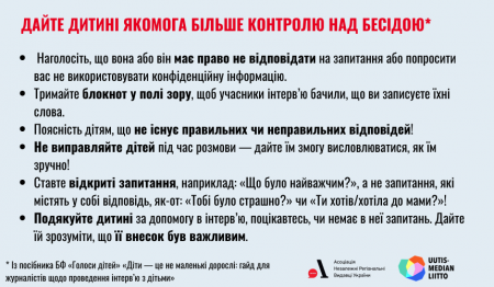 ЮНІСЕФ наголошує, що інтерв’ю з дітьми має проводитися максимально обережно: журналісти повинні уникати запитань, які можуть викликати біль чи ретравматизацію, не допускати постановочних історій і завжди отримувати усвідомлену згоду дитини або її законного представника. Важливо створювати безпечні умови — обмежувати кількість інтерв’юєрів, пояснювати мету розмови зрозумілою мовою та дбати, щоб дитина почувалася вільно й не зазнавала тиску.