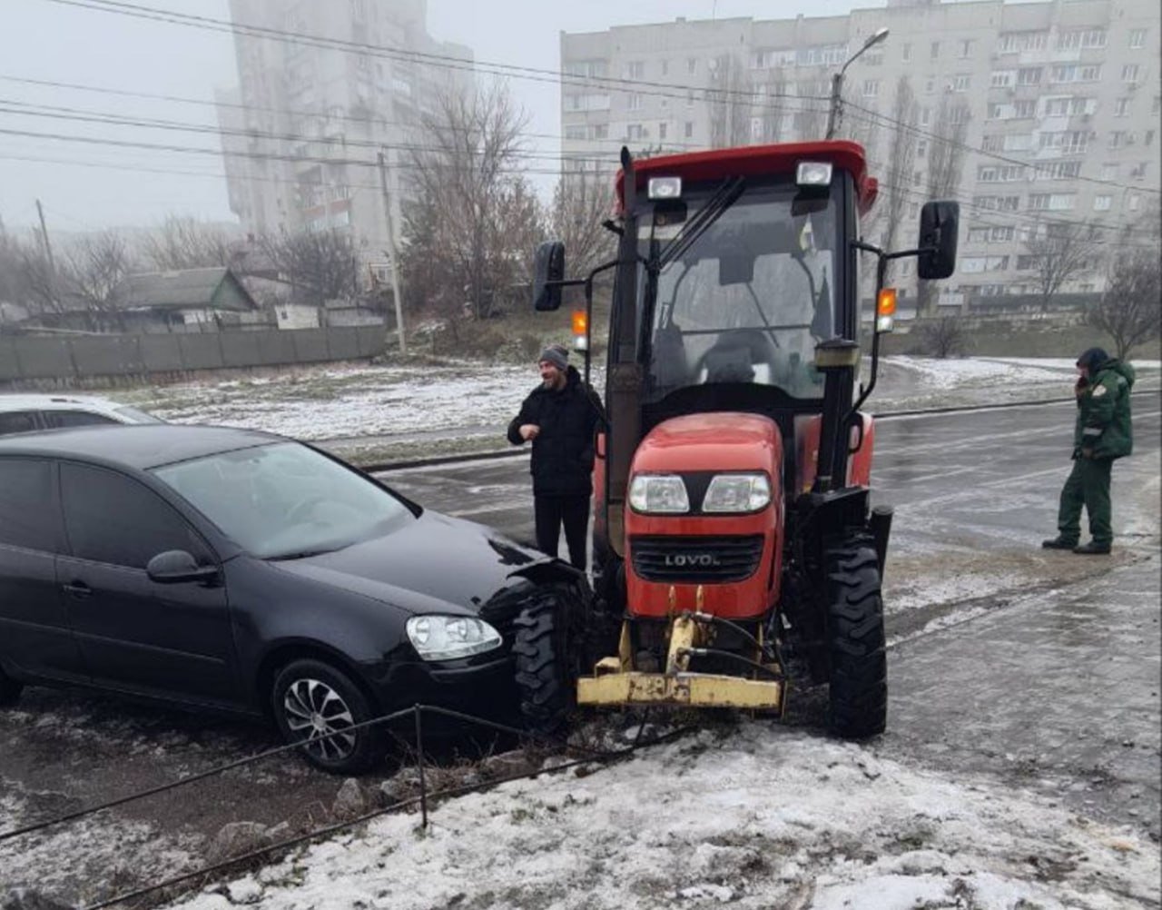 Відповідно, через це збільшилася кількість аварій. До прикладу, на тій же Європейській зіткнулися автівка та трактор, який посипав дорогу від ожеледиці.