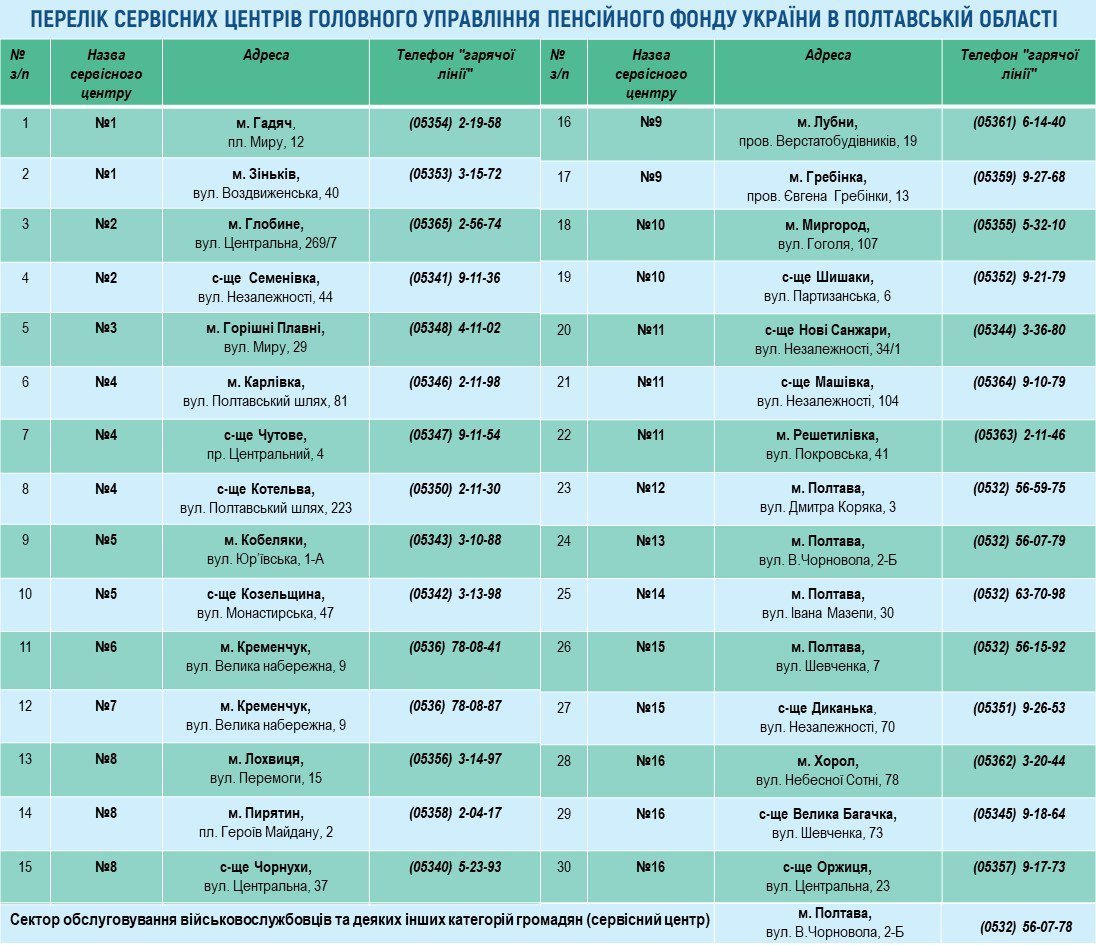 Отримати консультації щодо пенсійного забезпечення, надання страхових виплат, соціальних послуг, житлових субсидій і пільг та з інших питань, що стосуються діяльності Пенсійного фонду, можна особисто та за телефоном у сервісних центрах ГУ Пенсійного фонду України в Полтавській області.