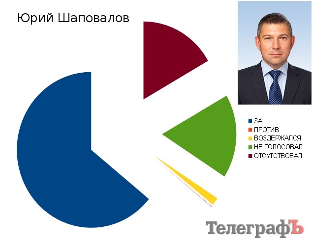 За всё время, с 12 декабря 2012 года, Верховная Рада голосовала по 1224 вопросам. При этом Юрий Шаповалов только один раз голосовал «Против». 20 раз наш избранник «Воздержался», а 785 – был «За». В остальных случаях голосования он или отсутствовал, или просто не голосовал.