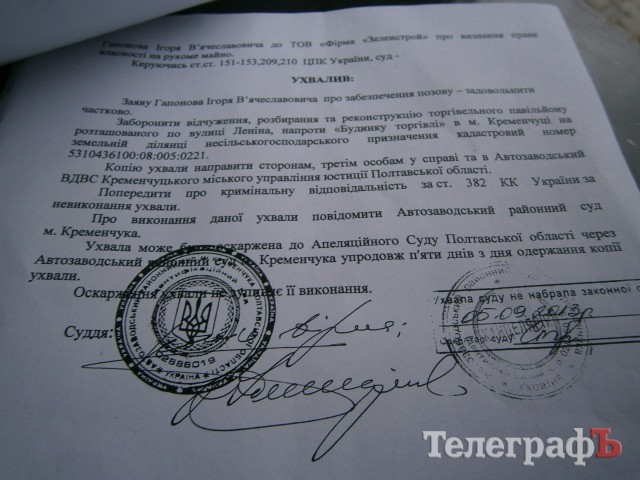 Сегодня Автозаводской райсуд Кременчуга принял решение о запрете разборки и реконструкции торгового павильона «Буфет», который расположен напротив Дома торговли. Суд постановил предупредить всех об уголовной ответственности за невыполнение постановления (копия постановления — прилагается).