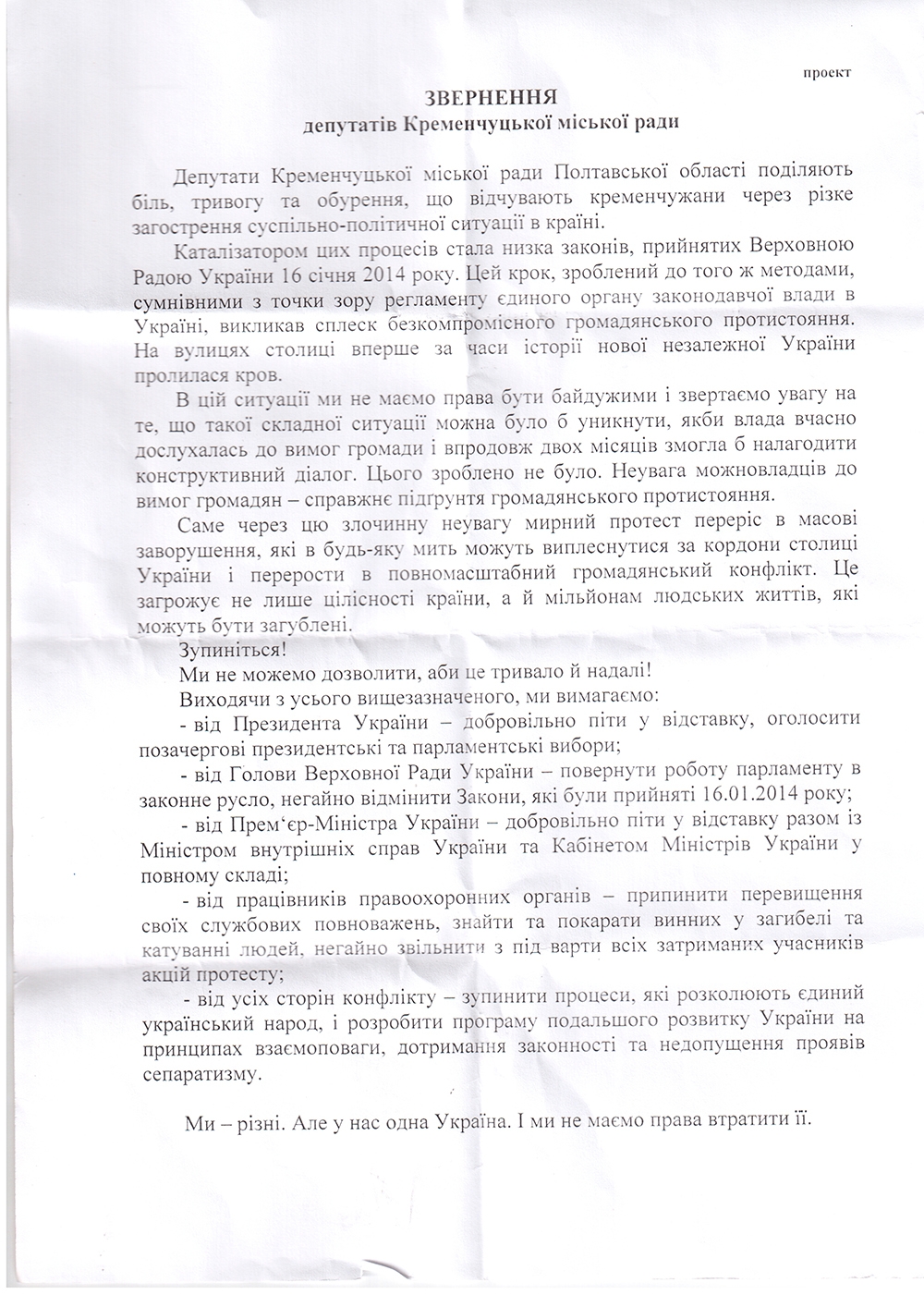 Депутат Дмитрий Кравченко зачитал обращение сессии и предложил за него проголосовать. Депутаты фракции "Партии регионов" за обращение не голосовали. Против были и коммунисты. депутатов "Рідного міста" также было мало. Однако ведущий заявил, что решение принято большинством.