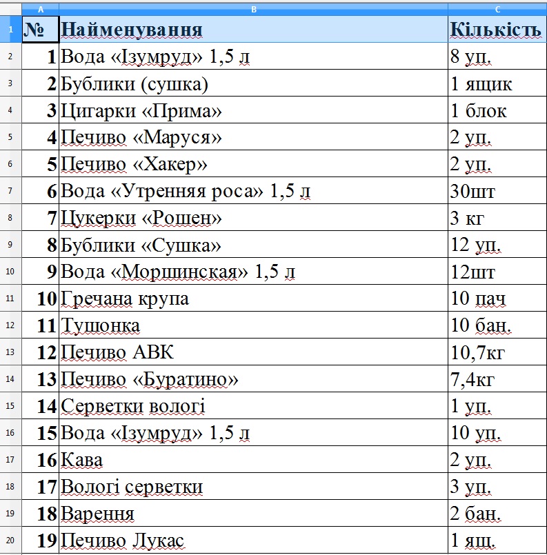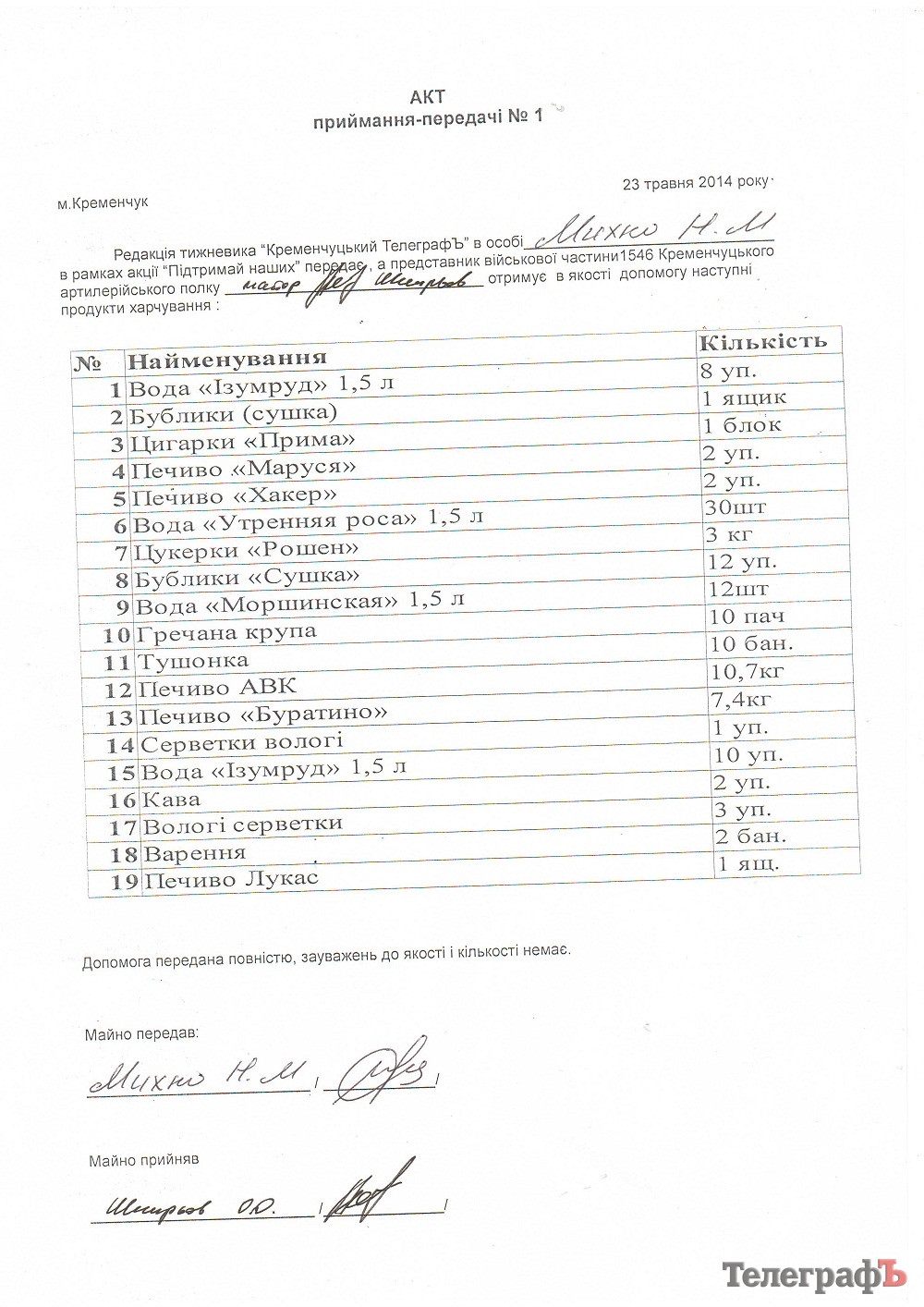 В основном, кременчужане принесли воду, продукты питания и сигареты. Ниже – полный список того, что мы передали по акту.