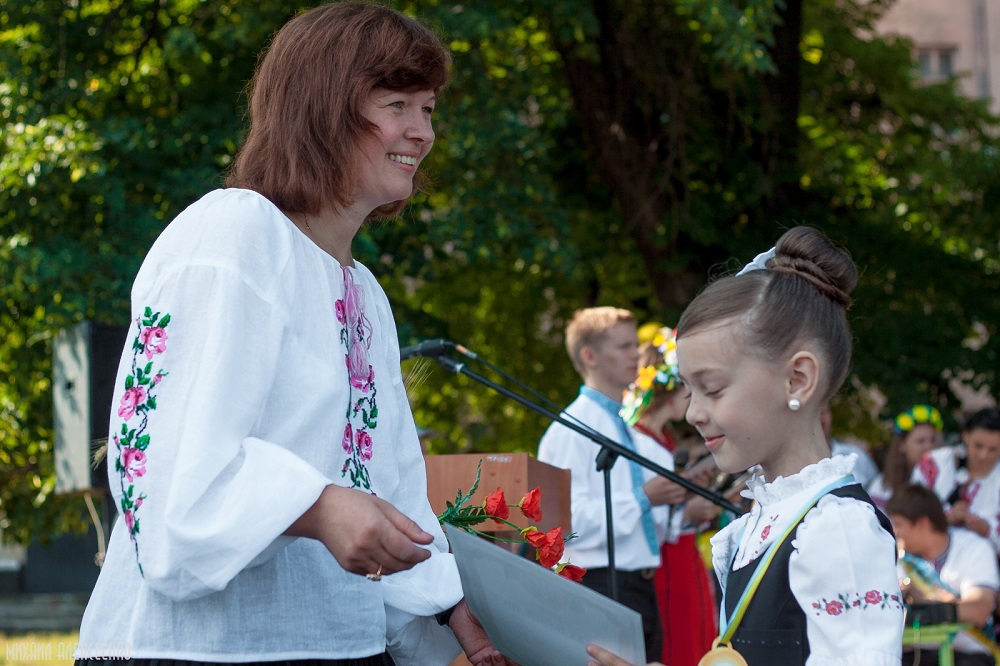 «Кременчугский ТелеграфЪ» отправился в гимназию №5, им. Т.Шевченко. Нарядные школьники выстроились в ряды, а за ними стали родители. В украинских вышиванках были по 3-5 детей почти в каждом классе. 6-А пришел в вышиванках всем классом.