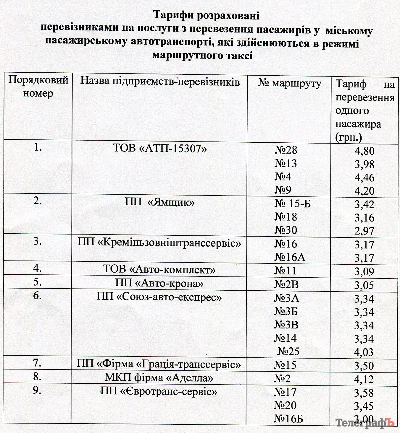 В Кременчуге планируется повышение цены на проезд в маршрутных такси – до 3 грн (вместо 2,50) и автобусах общего пользования (в обычном режиме) – до 2 грн (вместо 1,75). Цену поездки на самом длинном городском маршруте №25 планируют утвердить в размере 4 грн.