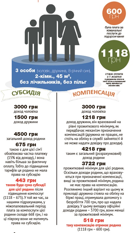 Тарифи зросли, і, щоб не платити зайве, порахуйте: можливо, ваша родина має право на житлову субсидію або компенсацію від держави. Субсидія – більш вигідний варіант. Але новий вид допомоги – компенсація, на відміну від субсидії, призначається навіть тоді, коли людина не має офіційної довідки про доходи.