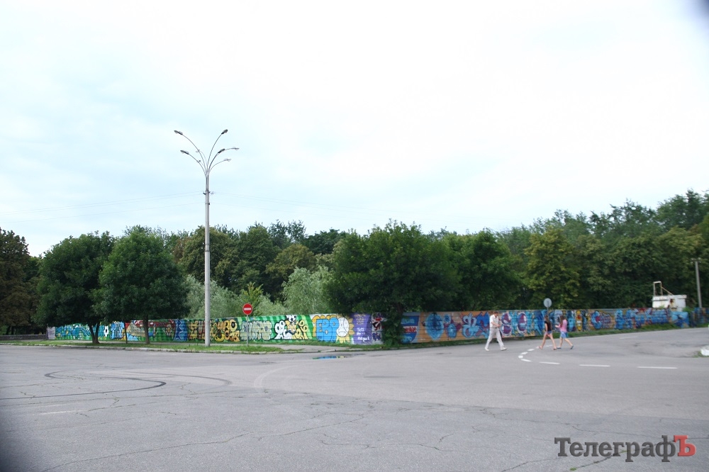 Район гостиницы «Кремень». За этим разрисованным забором уже в этом году намеревались начать строительство торгово-административного жилого комплекса. Но теперь сроки начала стройки перенесли на второй квартал 2015 года.