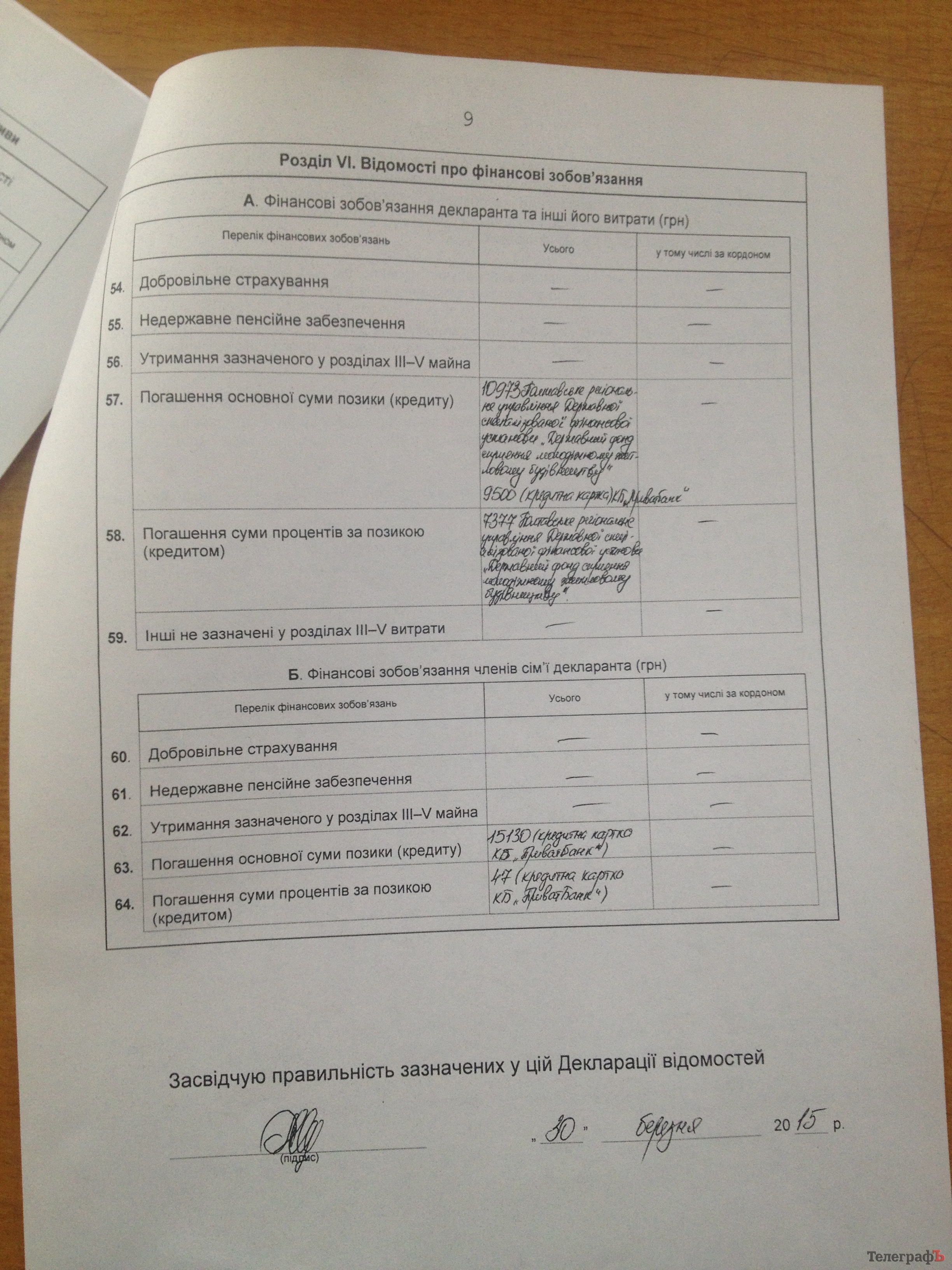 • среди финансовых обязательств Шаповалов указал погашение основной суммы займа (кредита) в сумме 10 973 грн (Полтавское региональное управление Государственного специализированного финансового учреждения «Государственный фонд содействия молодежному жилищному строительству»), а также 9 500 грн (кредитная карточка ПАО КБ «ПриватБанк») и погашение суммы процентов по займу (кредиту) - 7 377 грн (Полтавское региональное управление Государственного специализированного финансового учреждения« Государственный фонд содействия молодежному жилищному строительству»);