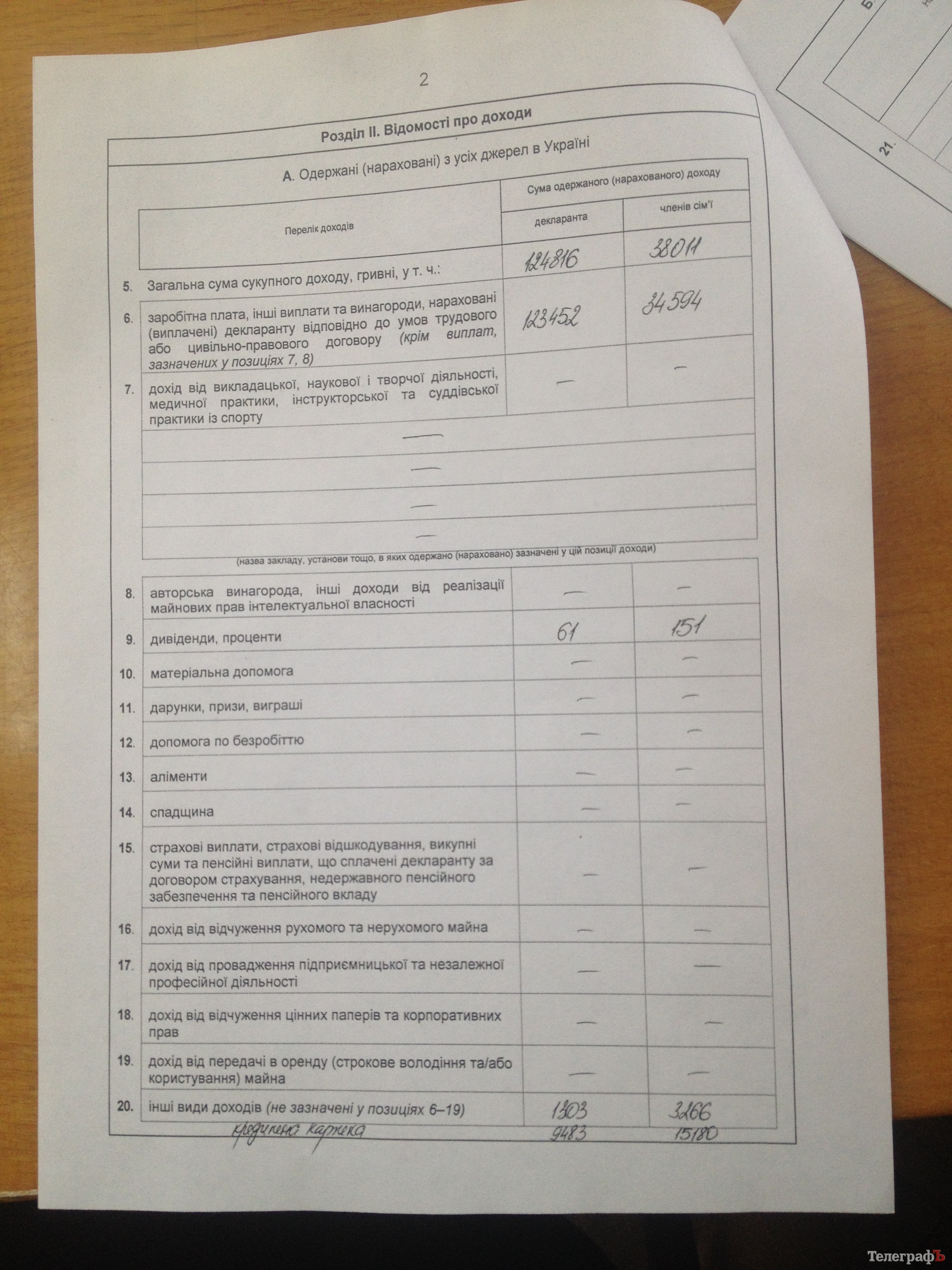 • 124 816 грн общего совокупного дохода, из которых заработная плата, другие выплаты и вознаграждения, начисленные (выплаченные) в соответствии с условиями трудового или гражданско-правового договора составили 123 452 гривны, 61 грн дивидендов, процентов, 1303 грн других доходов. Также в декларации указано 9 483 грн дохода, полученного с кредитной банковской карточки;