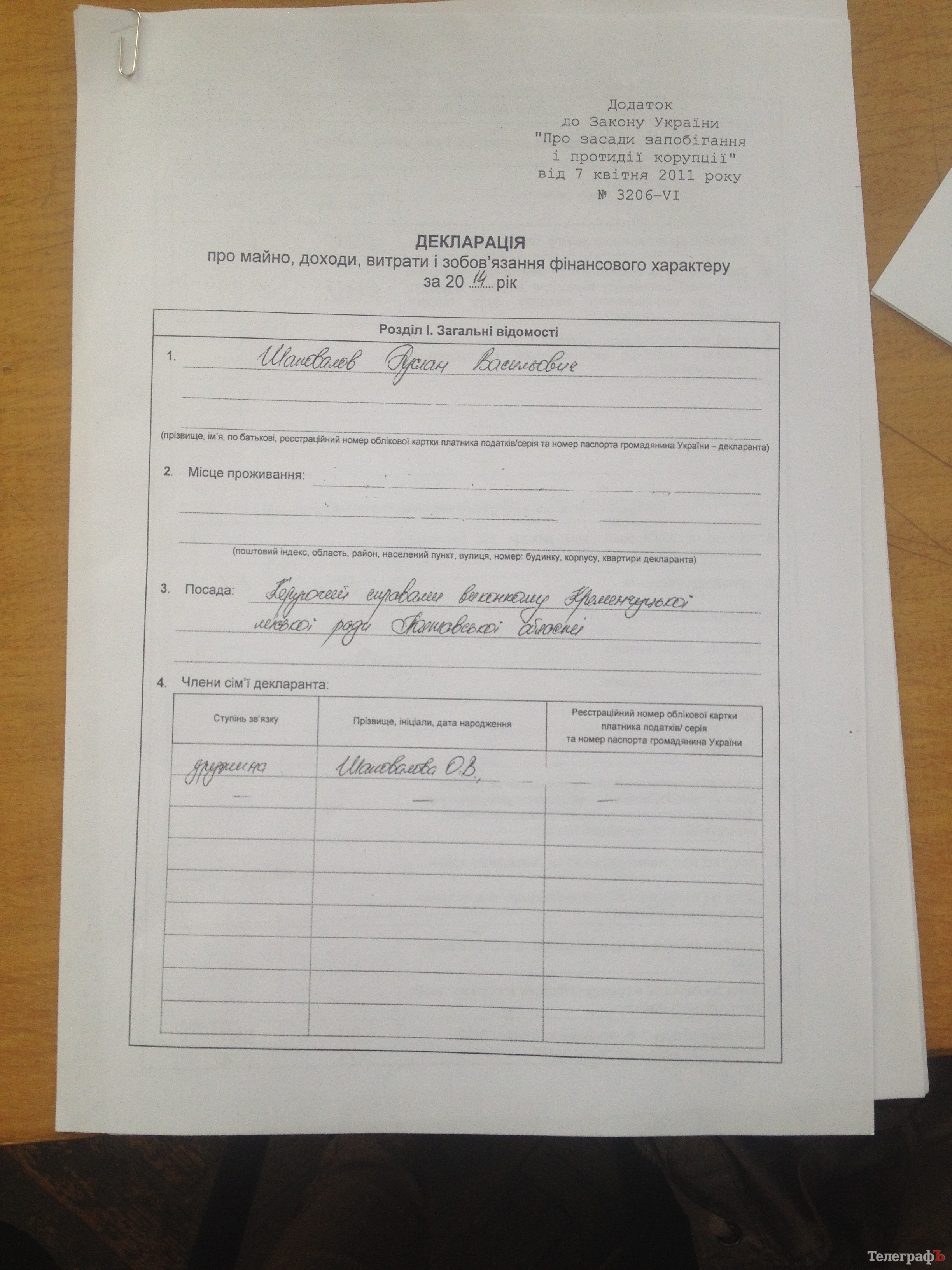 Управляющий делами исполкома городского совета Шаповалов Р.В. в декларации об имуществе, доходах, расходах и обязательствах финансового характера за 2014 задекларировал