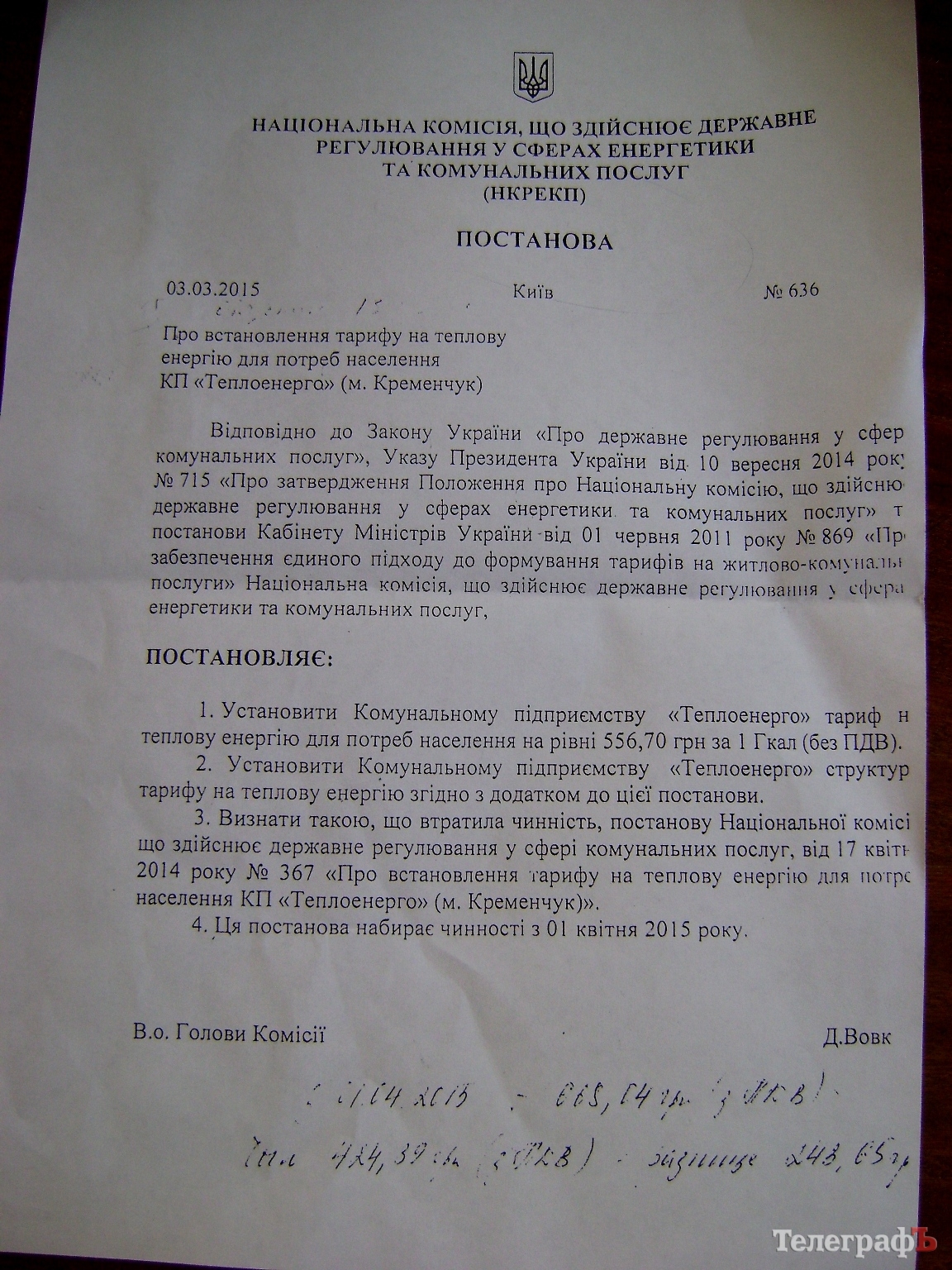 Ниже – копия документа, которая была предоставлена «Телеграфу». (Цена за 1 Гкал тепла указана без НДС – 556,7 грн; в платежках кременчужан, которые живут в домах с тепловыми счетчиками, фигурирует цена с НДС – 668,04 грн за 1 Гкал). Но сам «документ» вызвал у нас сомнения в его легитимности. И вот почему: на предоставленной копии нет ни подписи, ни печати, ни регистрационного номера Минюста, как того требует процедура оформления документов.