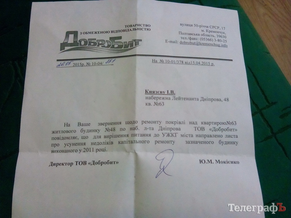 «Здравствуйте, дорогая редакция! Устал от безразличия нашей доблестной компании "Добробыт", ну и, соответственно покрывающего, их УЖКХ города. У меня с апреля этого года течёт крыша. Я написал заявление в «Добробыт», у меня его приняли и зарегистрировали. А потом началось: крыша на гарантии и так далее. Сказали: идите в горисполком, в УЖКХ… Там сказали: мы разберёмся. Приходили комиссии и оттуда и отсюда. Но никаких действий не последовало. А пятно на потолке с размера 30 на 50 превратилось в 80 на 200, ну и в ведра в квартире во время дождя. Прошу, помогите!»