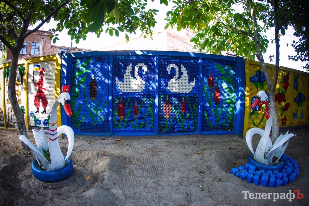Наш сусід із шин зробив лебедів. Довго думаючи вирішили розмістити їх під деревом, а за ними зобразити очерет. За 4 дні майже закінчили роботу. Не вистачило трохи кришечок. Тому з сусідом кожного ранку ходили в парк за матеріалом.