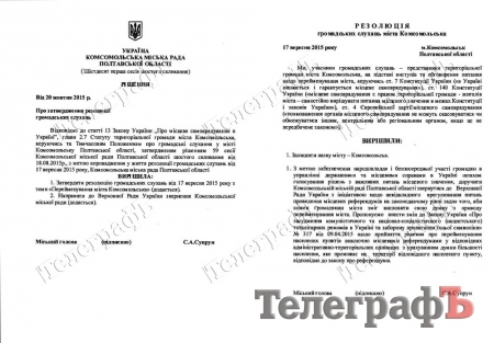 «ТелеграфЪ» за запитом отримав рішення Комсомольської міської ради. Так, міська рада 20 жовтня затвердила резолюцію громадських слухань, де більшість присутніх висловилася за збереження назви Комсомольськ.