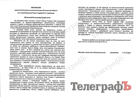 «Виступаючі під час слухань акцентували увагу на тому, що місто Комсомольськ було назване на честь першопрохідців, які приїхали за комсомольськими путівками та з романтичним настроєм у душі будували місто на Дніпрі для робітників майбутнього гірничо-збагачувального комбінату. Саме вони на піщаних берегах Дніпра звели місто-красень Комсомольськ. Назва нашого міста – це його особливий дух, пам'ять про покоління його будівничих – першопрохідців, особливої категорії мешканців міста, які висловили одностайну думку: залишити назву міста – Комсомольськ».