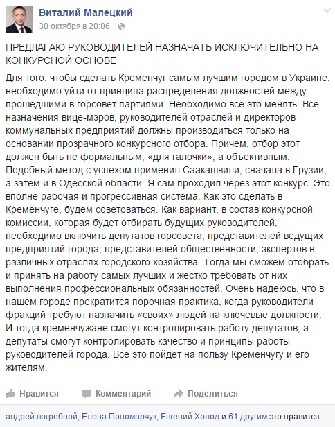 Она напоминает о прозрачности, которую обещал Малецкий в своих постах на Фейсбук.
