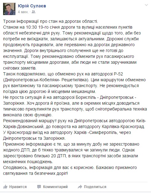 На Полтавщині із значним погіршенням погодних умов (сильний сніг, хуртовина, снігові перемети), з 18-00 год. 18.01.2016 р. обмежено рух вантажного автотранспорту та автобусів по а/д Р-52 Дніпропетровськ – Царичанка – Кобеляки – Решетилівка на всій протяжності від межі Дніпропетровської області (де зазначена дорога теж перекрита) до а/д М-03 Київ – Харків – Довжанський та по а/д Т-17-37 /М-03/ – Бочки – Новий Байрак – Петрівка.