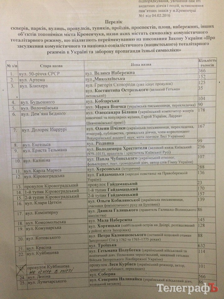 Список улиц, которые были обязательны к переименованию закончен. Список с новыми названиями, за которые голосовала комиссия, должен послужить рекомендацией мэру Кременчуга для принятия окончательного решения о переименовании.