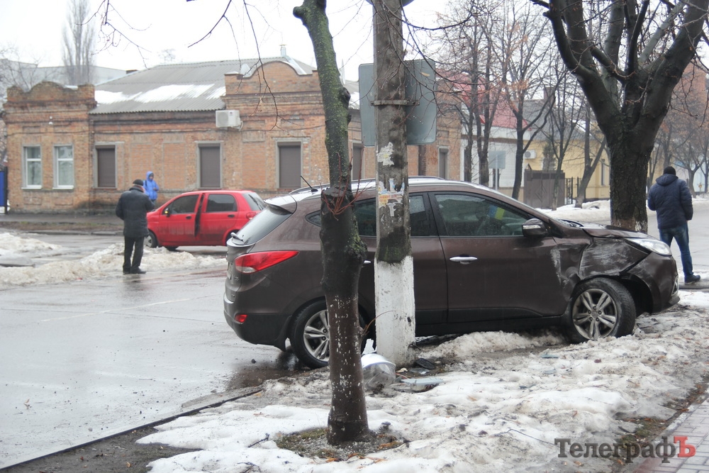 В Кременчуге на мистическом перекрестке снова ДТП. Столкнулись Hyundai ix35 и Daewoo Matiz. Водитель Hyundai двигался по ул. Шевченко. На перекрестке он столкнулся с Matiz, который выезжал со второстепенной ул. Бутырина. В результате у автомобиля Daewoo Matiz смялся "передок", а Hyundai влетел в дерево на обочине.