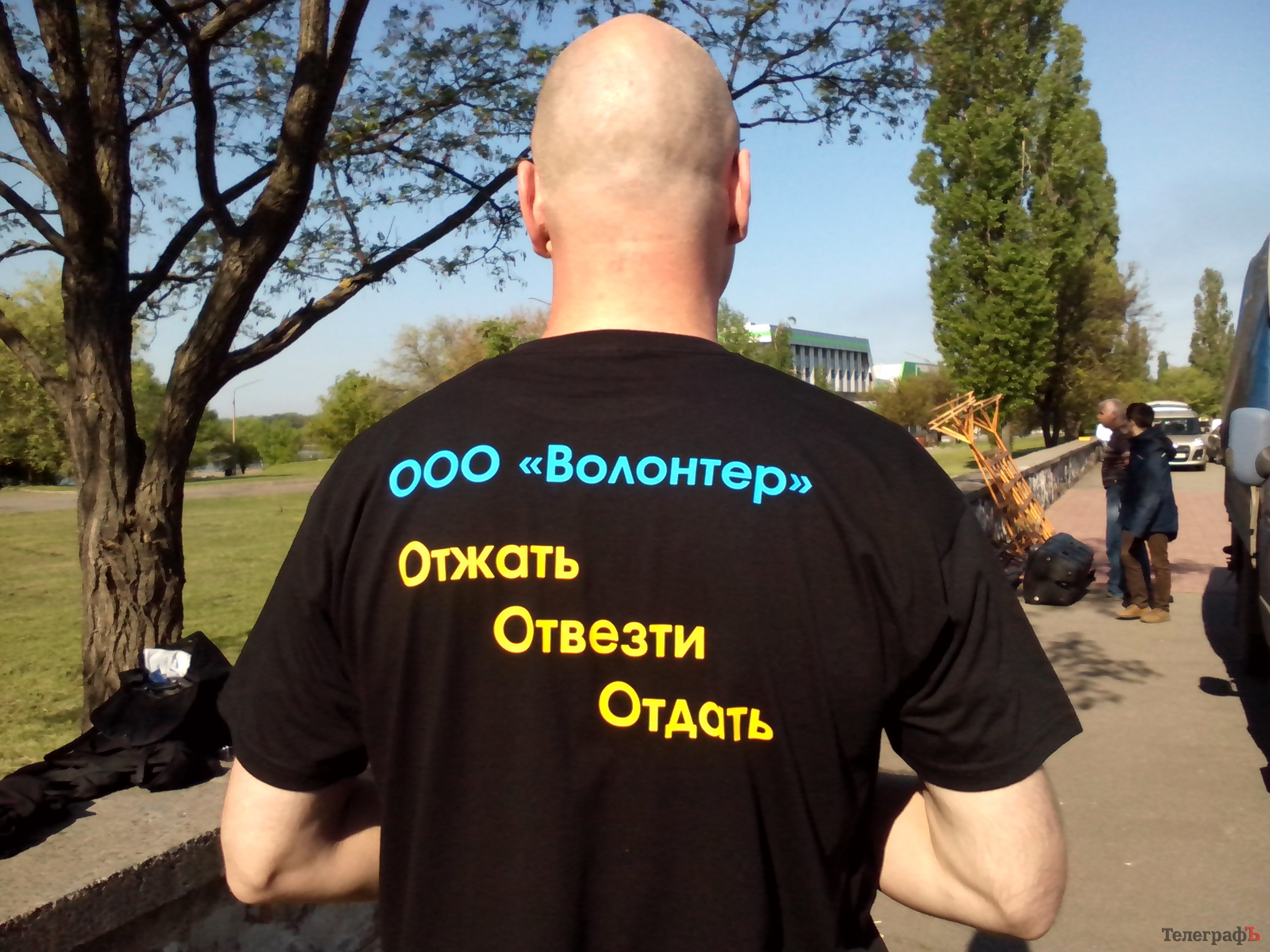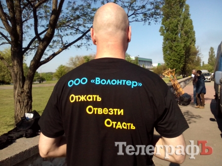 1. Команда волонтеров сегодня в креативных футболках. Их девиз "Отжать, отвезти, отдать". Командир команды - известный кременчугский волонтер - Марина Шляпина.