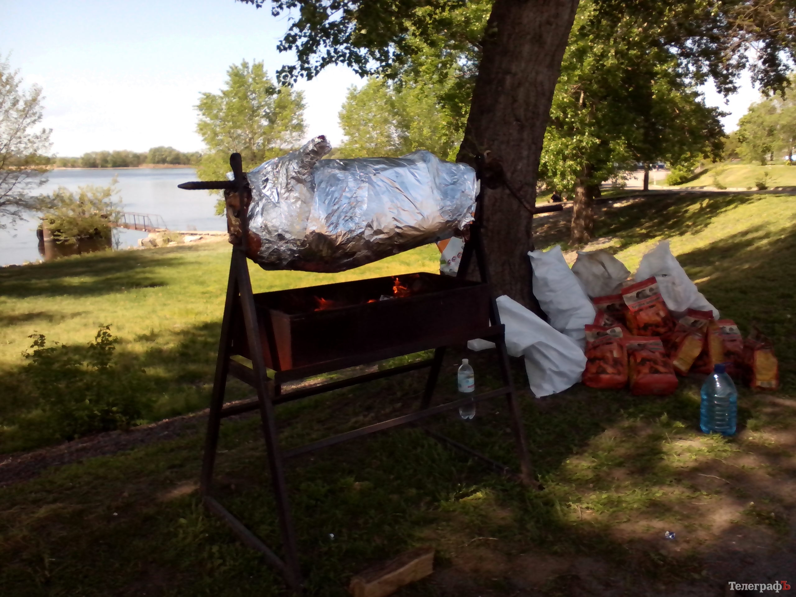 Кабанчик, как и обещали, уже в процессе приготовления. Рядом - машина спасателей - контролируют процесс, чтобы все было безопасно.