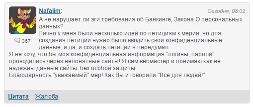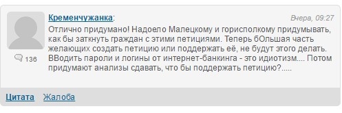 По мнению исполкома, это нужно для того, чтобы получить достоверные данные пользователя, который подписывает петицию. Как сообщил журналистам мэр Кременчуга Виталий Малецкий, за последние дни, после введения идентификации пользователей через ID-банкинг, количество тех, кто подписывает электронные петиции, уменьшилось в 10 раз.