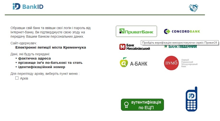 Недавно на сайте горсовета в разделе электронных петиций появилось нововведение. Теперь для того, чтобы поддержать петицию, нужно пройти авторизацию с помощью системы BankID - пройти идентификацию через банк.