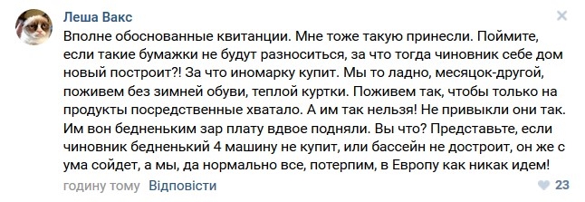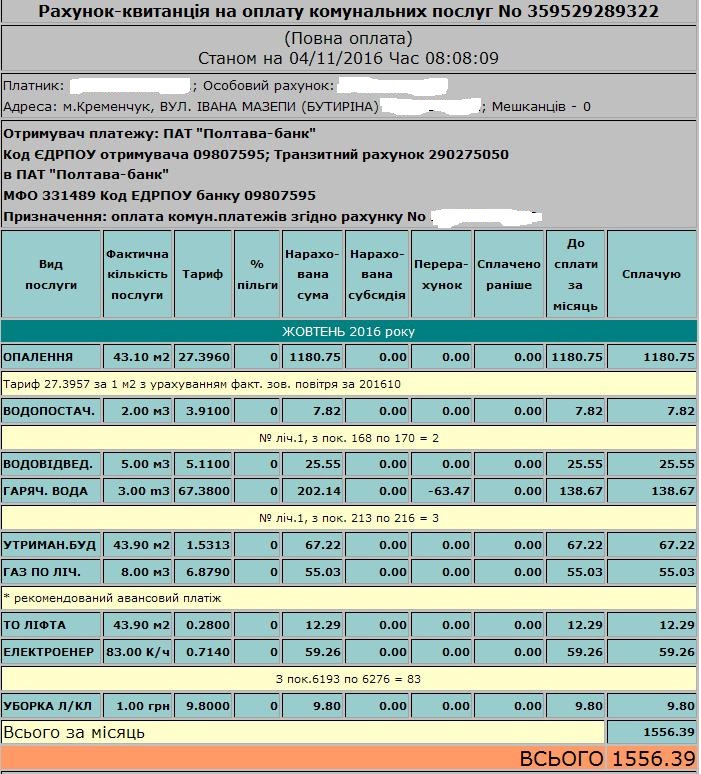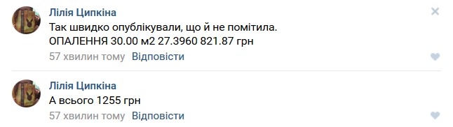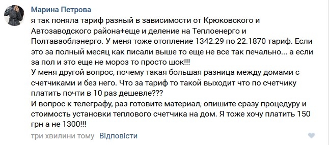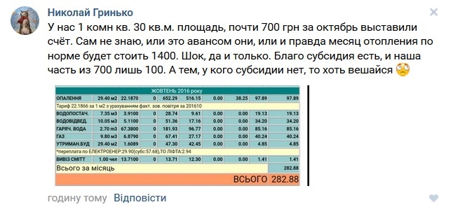 - Здравствуйте. Сегодня обалдела, глянув на счет за коммунальные услуги. Особо порадовал тариф за отопление: 27,396 грн за м2 и это только за 20 дней октября (отопление дали 12 числа). Тариф за полный месяц получается 42,463 грн за м2. Откуда взят этот тариф?! Если в прошлом году тариф был 14,75 грн за м2, стоимость Гкал в этом году увеличилась на 95%, а тариф повысился в 2,9 раза! - написала в редакцию кременчужанка Любовь.