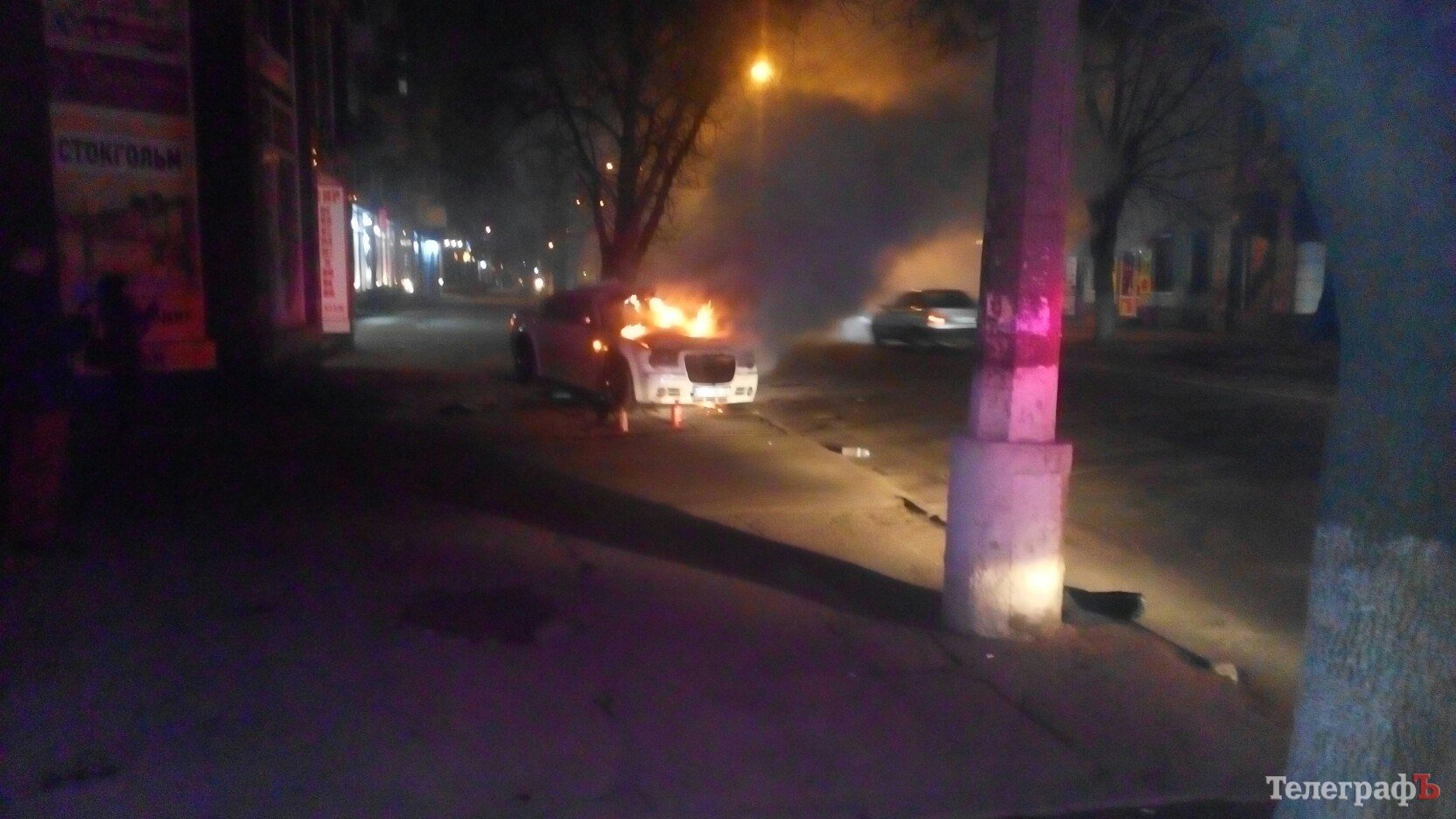 Вечером 12 марта в центре Кременчуга загорелся автомобиль Сhrysler белого цвета, припаркованный на ул. Небесной Сотни в районе кафе «Маска».