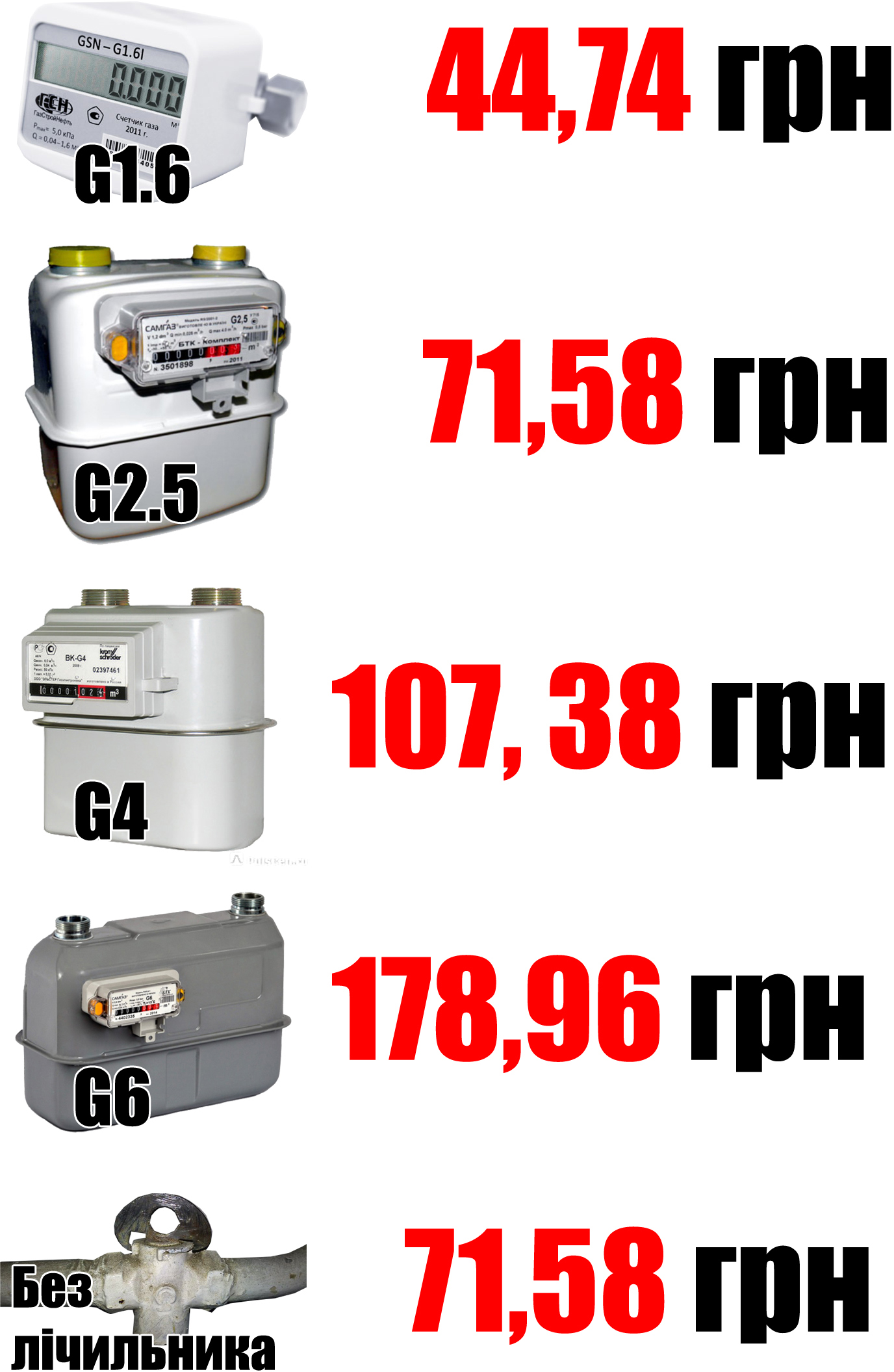 Примітка: Плата для лічильника G1,6 (у квартирах лише з газовими плитами) наведена за розрахунками ПАТ «Кременчукгаз» - за 30 днів. У розрахунках на інші типи лічильників застосовані коефіцієнти, наведені в презентації НКРЕКП для кожного типорозміру лічильника порівняно з мінімальним (G1,6). Для G2,5 коефіцієнт складає 1,6 (44,74х1,6 =71,58), для G4 - коефіцієнт 2,4; для G6 - 4.