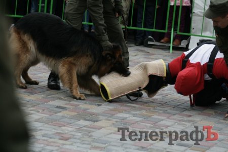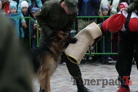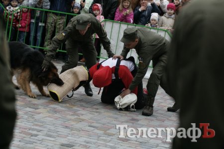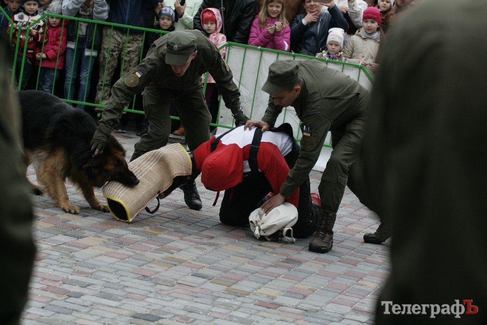 12.26 Парад открыла собака с нацгвардии «Східна зірка», 8-летний Ахтай не однократно помогал при задержании преступников. Под руководством солдата Максима Пилипенко она показала свои умения перед публикой. В сценке собака продемонстрировала, как задержать негодяя, который украл у женщины сумочку.