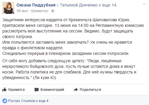 12.17. Заявление Пиддубной относительно злоупотребления властью нардепа Юрия Шаповалова. Она утверждает, что родственник нардепа (и по совместительству водитель) получил за бесценок землю на берегу Днепра (речь идет о предприятии "Элеватор Кремлогистик"). Оксана Пиддубная проинформировал, что обратилась в Генпрокуратуру, и по ее заявлению проводится расследование.