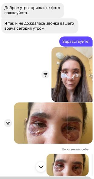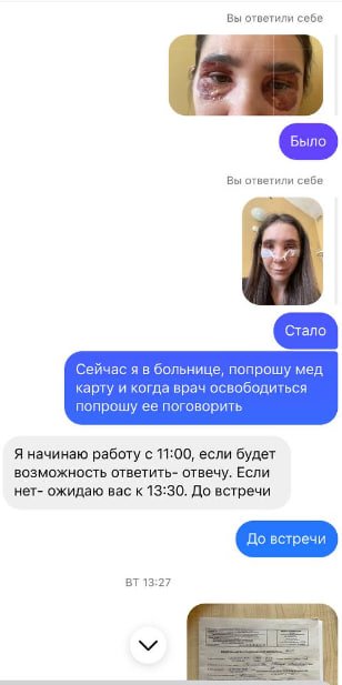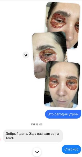 У неділю мені стало гірше. Це був просто пекельний біль. Все обличчя припухло, я не могла розплющити очі, вже майже не бачила — хіба що краєм ока. Написала про свій стан, запитала, чи потрібно звернутися до лікаря. Власниця салону мені запропонувала надіслати лікаря, який приїде мене оглянути вдома. Мов, навіщо мені їхати до лікарні, аби мене там такою бачили. Приїхав лікар-офтальмолог, привіз із собою рецептурну мазь. Я запитала його, чи все зі мною добре. Лікар відповів, що так, це така процедура, така технологія.