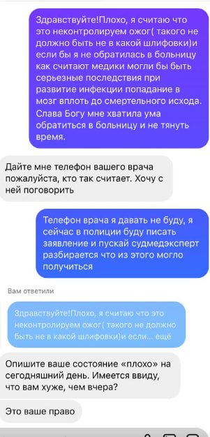 — Так, спочатку мій чоловік зателефонував і запитав у майстра, як так вийшло. Майстер відповіла йому: «Вона знала, на що вона йшла. Я їй сказала, що буду робити шліфування, а шліфування передбачає опік. Ось у неї опік». Пояснила, що лікарі некомпетентні, бо не розуміють мій стан після цієї процедури.