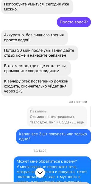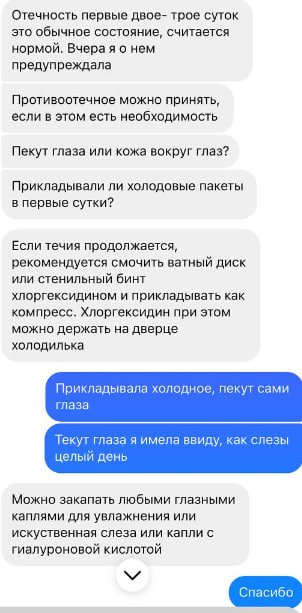 Я написала власниці салону в Інстаграм-чаті. Вона мене заспокоїла, що набряклість протягом трьох діб — це нормально. У чаті мені кинули, які ліки потрібно придбати.