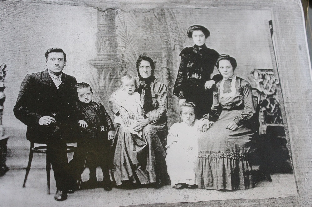 "На цьому фото Клавдія (сидить справа), старенька мати Івана, Іван, його сестра Нюся і їхні троє діток. Але з тих, що на фото, залишилася тільки моя бабця Аня, яка сидить на руках у матері Івана, - розповідає Ангеліна Прихожа. – Хлопчик і старша дівчинка померли від холери. Усього в них було п’ятеро дітей, які досягли повноліття"