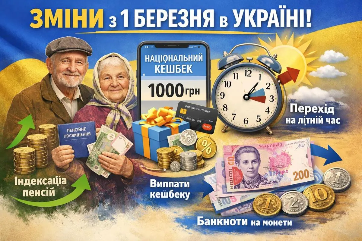 У перший місяць весни набуває чинності низка рішень та змін, які вплинуть на життя багатьох громадян – він принесе українцям багато ключових змін, деякі з яких торкнуться усіх, а інші лише окремих категорій. Вони пов’язані з індексацією пенсій, зміною правил нарахування кешбеку, заміною банкнот чотирьох номіналів, а наприкінці місяця країна традиційно перейде на літній час.