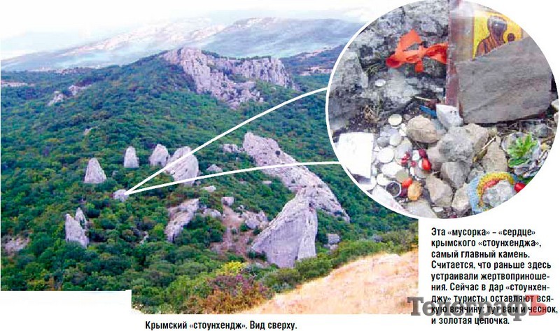 Эта «мусорка» – «сердце» крымского «стоунхенджа», самый главный камень. Считается, что раньше здесь устраивали жертвоприношения. Сейчас в дар «стоунхенджу» туристы оставляют всякую всячину: тут вам и чеснок, и золотая цепочка.