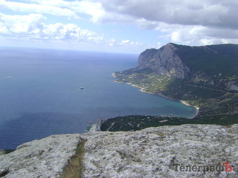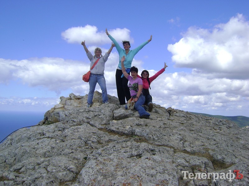 Пока наши экскурсоводы были заняты съёмками, у нас объявился еще один попутчик, который вызвался провести нас на вершину коротким путем – в горах люди завязывают знакомства легко и быстро. Короткая дорога Валерия, мастера спорта по легкой атлетике, оказалась почти вертикальным подъёмом. Честно – было жутковато, карабкаться пришлось на своих четырех. Неверно поставишь ногу – «улетишь» в обрыв метров так на десять. В последствии оказалось, что Валера пощадил наши нервы – уже на обратной дороге, когда мы спустились с горы, он рассказал, что в прошлом году с подъема сорвался и погиб инструктор... Нам повезло, что «короткая дорога» мастера спорта длилась не долго и мы наконец оказались на самой вершине – 681 м над уровнем моря. Карабкаться к краю тоже пришлось «на четырех» – на вершине такой ветер, что кажется, словно тебя вот-вот и снесет. Зато красотищу пером уж точно не описать – увидеть ее можно и на фото, но лучше съездить и посмотреть собственными глазами.
