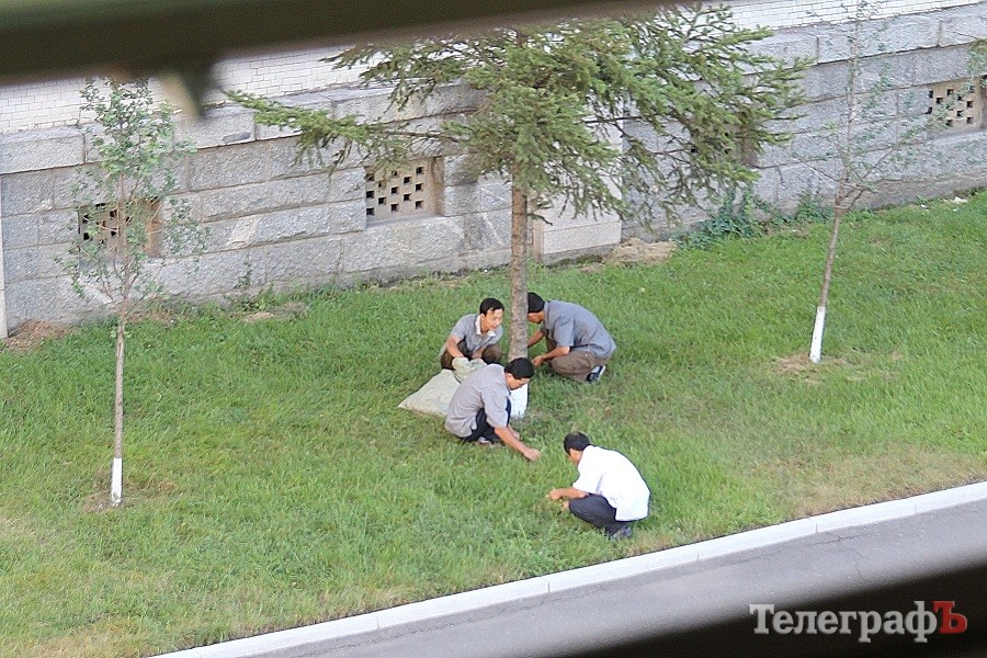 Кадр из окна библиотеки в Пхеньяне - местная интеллигенция «подстригает» траву на газоне методом ручного переламывания травинки пополам с последующей утилизацией сорванного в мешок:) В другом месте видел, как травку подстригают канцелярскими ножницами и поливают из лейки вручную:( «До изобретения газонокосилки в Корее оставалось 25 лет...» - зато все заняты работой.