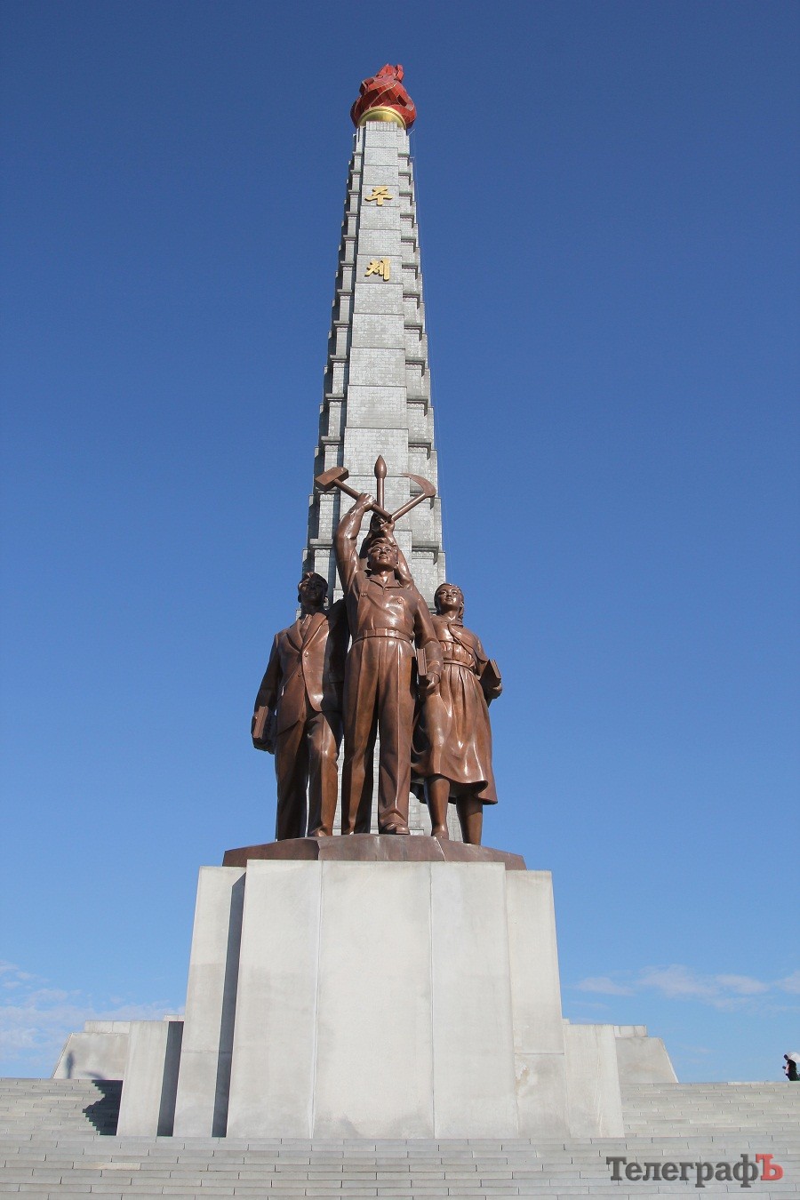 Бронзовый монумент, символизирующий... ну вы знаете. Корейцы добавили только ещё интеллигента с кистью. На заднем плане — гранитный 170-метровый обелиск идеям чучхе, откуда открывается изумительный вид на столицу Кореи. Площадка под факелом на 150-метровой высоте открытая, без решеток. Табличек «Прыгать вниз нельзя» тоже нет:)