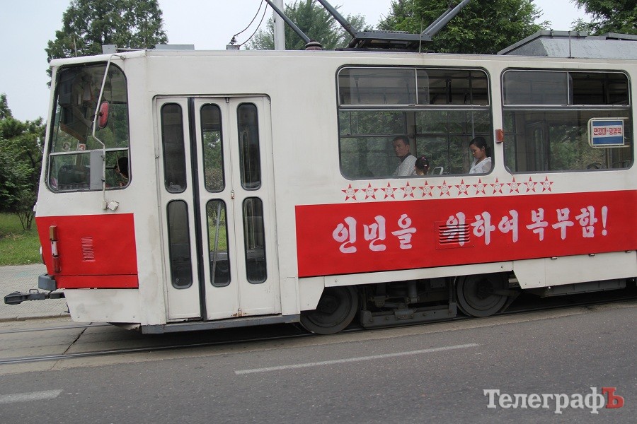 Звёздочки, нарисованные на боку этого трамвая, вовсе не означают количество сбитых пешеходов - так отмечают пробег общественного транспорта. Одна звезда - 50.000 километров, на борту их -12, итого - 600.000 километров. По Пхеньяну колесит допотопный троллейбус с несколькими десятками звёзд на борту, на ходу посчитать не удалось и сфоткать не успели, жаль, но полтора-два миллиона километров он точно вытерпел! Вот какие корейцы бережливые...
