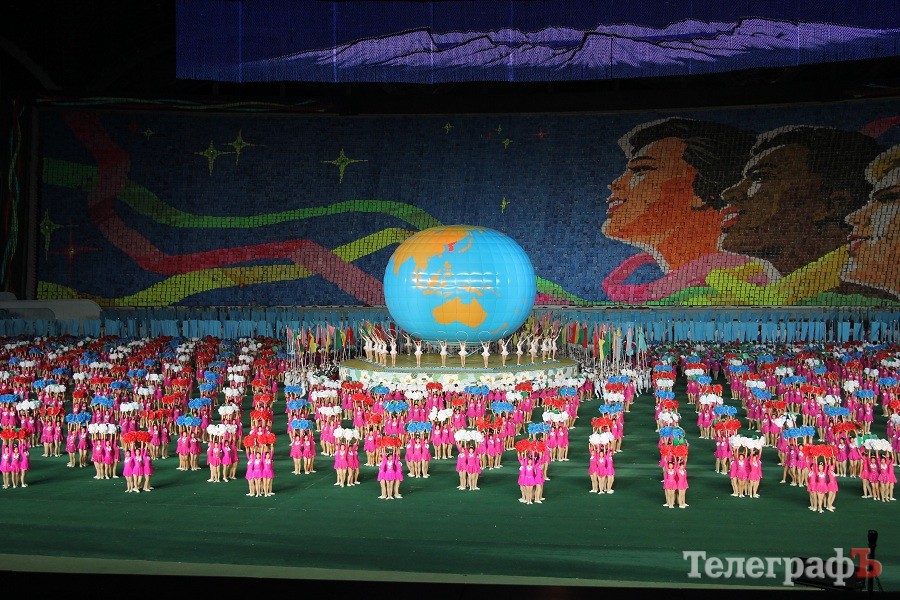 «Ариран» - массовое танцевально-акробатическое мероприятие с участием 100 тысяч (!) гимнастов на самом большом в мире (!) стадионе 1 Мая в Пхеньяне. Только ради этого зрелища стоило бы пролететь 7 тысяч километров... На заднем плане - трибуна с «живым» панно из 18 тысяч человеко-пикселей, на котором невидимый художник рисует изумительные картины. Одновременно на арене находятся до 50 тысяч гимнастов. Билеты для туристов стоят от 80 до 150 евро - дороговато, но оно того стоит, поверьте на слово...