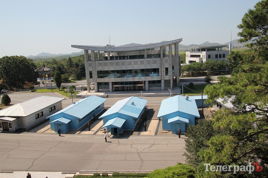 Граница с Южной Кореей - демаркационная линия проходит ровно посредине сараев, в которых время от времени проходят безрезультатные переговоры сторон. В «сарайки» можно зайти и пофотографироваться с солдатами, но только с северокорейскими. Южан на границе не видно, видимо, им лень дежурить - издали наблюдают...