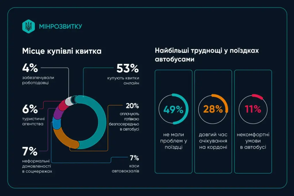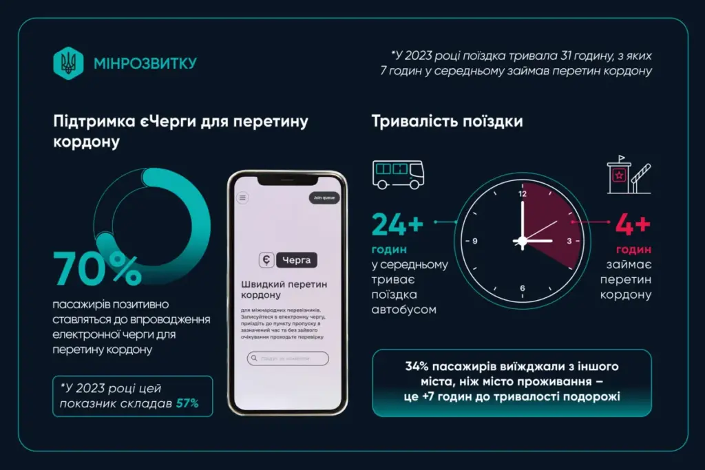 Водночас 82% пасажирів сказали, що загалом задоволені міжнародними автобусними перевезеннями. У міністерстві зазначили, що порівняно з 2023 роком середня тривалість поїздки скоротилася з 30,8 до 24,4 години, а середній час очікування на кордоні — з 7,1 до 4,7 години.