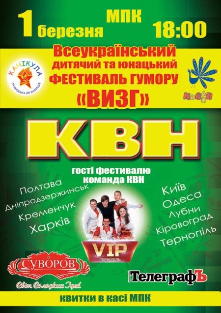 "Кременчугский ТелеграфЪ" разыгрывает 10 билетов на третий Всеукраинский детский и юношеский фестиваль юмора «ВИЗГ – 2013» который состоится 1 марта в ГДК. Пять участников розыгрыша получат по 2 билета. Для того, чтобы принять участие в розыгрыше, нужно ответить на вопросы и заполнить анкету. Правильные ответы вы сможете найти на нашем сайте, в новостях. Анкеты принимаются до 27 февраля включительно. 28 февраля состоится жеребьевка — мы назовем победителей (видео будет размещено на нашем сайте).