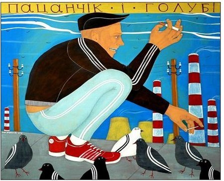 Многие видели его картины с «чёткими гопниками», голубями и котами в «адидасе».