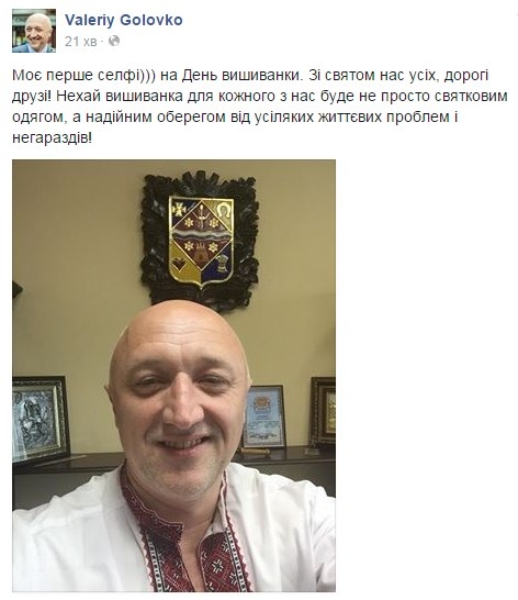 На своем Facebook глава Полтавской обладминистрации Валерий Головко в честь Дня вышиванки выложил фото в вышиванке.