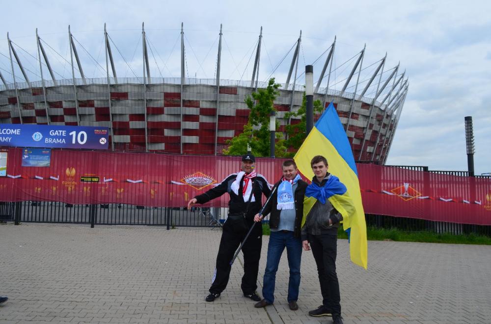 Варшава встретила морем красных футболок испанцев и таким же количеством флагов в руках и на спинах украинских фанатов. Было всякое: приветствовали друг друга фразой 'Слава Украине!', фотографировались с братьями по клубу прямо на улице, распевали гимн и "Червону руту" под аккомпанемент уличного музыканта. С нами даже фотографировались несколько фанатов Севильи. Среди болельщиков обоих клубов не было никакой враждебности, одаривали друг друга улыбками и желали хорошей игры.